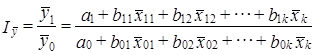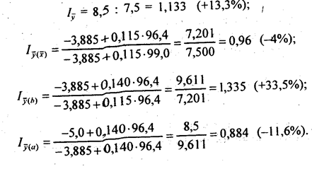 Чтобы обеспечить это равенство, нужно принять какое-то правило индексации. Например, в соответствии с уже высказанным положением сначала индексируются все x̅j при постоянных (базисных) значениях коэффициентов регрессии и свободного члена, затем индексируются коэффициенты регрессии при постоянных (отчетных) средних значениях x̅j, затем индексируется свободный член урвнения регрессии при постоянных (отчетных) значениях как x̅j, так и bj.