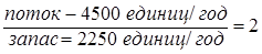 а число оборотов: 1125 единиц/квартал: 2437,5 ед. = 0,462 квартал-1. Как видим, при равномерном потоке и росте запаса, отношение потока к запасу постепенно уменьшается, скорость оборота замедляется. При равномерном потоке и сокращении запаса, наоборот, скорость оборота будет возрастать. Обратная величина - отношение запаса к потоку за год - составит: