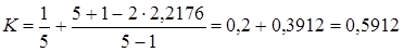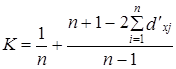Теперь, объединяем обе составляющие и получаем окончательный показатель степени концентрации объема признака в совокупности, состоящей из п единиц, проранжированных в порядке возрастания объема признака или доли его у данной единицы в общем объеме признака в совокупности. Обозначим его К: