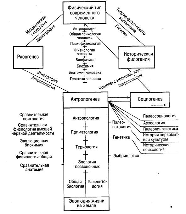 Специальной наукой о человеке как особом биологическом виде является антропология. В структуру современной антропологии включают три основных раздела: морфология человека (изучение индивидуальной изменчивости физического типа, возрастных стадий — от ранних стадий зародышевого развития до старости включительно, полового диморфизма, изменения физического развития человека под влиянием различных условий жизни и деятельности), учение об антропогенезе (об изменении природы ближайшего предка человека и самого человека в течение четвертичного периода), состоящее из приматоведения, эволюционной анатомии человека и палеоантропологии (изучающей ископаемые формы человека) и расоведение.
