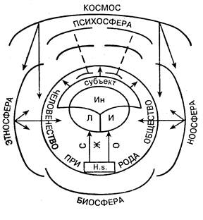 | Рис. 1.6. Схема общей структуры человека, развитие его свойств, внутренней и внешние взаимосвязи. H.s. — Homo sapiens (человек разумный, биологический вид); о — онтогенез; с — социализация; ж — жизненный путь; л — личность; и — индивид; Ин — индивидуальность (Из: Психология: Учебник./Под ред. А. А. Крылова. — М.: Проспект, 1999.) |
