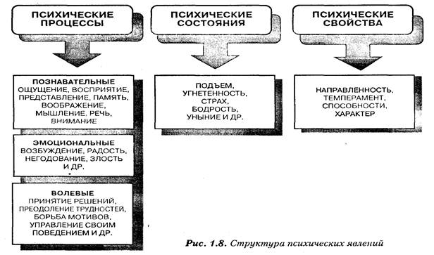 Для того чтобы ответить на этот вопрос, необходимо построить классификацию психических явлений. Следует отметить, что существуют различные точки зрения на структуру психических явлений. Например, те или иные психические явления в зависимости от автора позиции могут быть отнесены к разным структурным группам. Более того, очень часто в научной литературе можно столкнуться со смешением понятий. Так, некоторые авторы не разделяют характеристики психических процессов и психические свойства личности. Мы будем разделять психические явления на три основных класса: психические процессы, психические состояния и психические свойства личности (рис. 1.8).