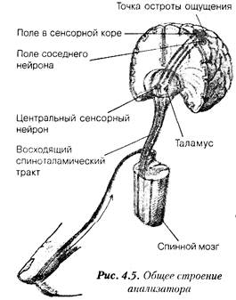 на всех уровнях, включая ЦНС. Следовательно, каждый анализатор состоит из трех структурных элементов: рецепторов, нервных волокон и соответствующих отделов ЦНС (рис. 4.5).