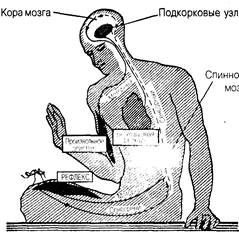 Любая сенсомоторная реакция рассматривалась как самостоятельное действие или элемент сложного психомоторного акта. С физиологической точки зрения сенсомоторные реакции рассматривались как условные рефлексы. Поясним эту точку зрения на примере (рис. 5.2). В ответ на укус комара человек невольно отдернул ногу — это безусловный рефлекс (1). Центральный момент его протекает в низших отделах нервной системы, хотя он также имеет свое корковое представительство, вследствие чего человек почувствовал боль. Одновременно боль вызвала изменение частоты сокращений сердца — это вегетативная реакция (2), которая связана с деятельностью вегетативной нервной системы; она замыкается в подкорковых узлах мозга, но также имеет свое корковое представительство. Рефлекторное движение ноги могло не согнать комара, и человек, до-сознания которого дошла боль, ударил рукой по комару, осуществив произвольное психомоторное действие (3). Вместе с тем это движение рукой было и его сенсомоторной реакцией, центральный момент которой протекал в коре головного мозга. Этот же моторный момент мог завершить и другую сенсомоторную реакцию. Человек мог не чувствовать боли, а увидеть комара, когда он еще только садился на ногу. В обоих случаях движения руки могли быть совершенно одинаковыми, но во втором случае сенсорным моментом служило бы уже не тактильное, а зрительное восприятие. Соответственно изменилась бы и локализация центрального момента реакции в мозге.