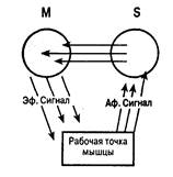 В упрощенном виде эта схема выглядит так: из моторного центра (М) в мышцу (рабочую точку мышцы) поступают эффекторные команды. От рабочей точки мышцы идут афферентные сигналы обратной связи в сенсорный центр (3). В ЦНС происходит переработка поступившей информации, т. е. перешифровка ее в моторные сигналы коррекции, после чего сигналы вновь поступают в мышцу. Получается кольцевой процесс управления (рис. 5.3).