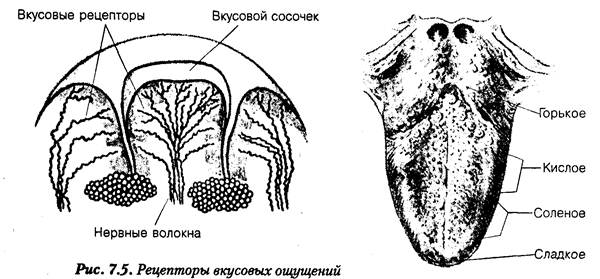 Вкусовые и обонятельные ощущения. Рецепторами вкусовых ощущений являются вкусовые луковицы, состоящие из чувствительных вкусовых клеток, соединенных с нервными волокнами (рис. 7.5). У взрослого человека вкусовые луковицы расположены главным образом на кончике, по краям и на задней части верхней поверхности языка. Середина верхней поверхности и вся нижняя поверхность языка не чувствительна к вкусу. Вкусовые луковицы также имеются на нёбе, миндалинах и задней стенке глотки. У детей область распространения вкусовых луковиц гораздо шире, чем у взрослых. Раздражителями для вкусовых рецепторов служат растворенные вкусовые вещества.
