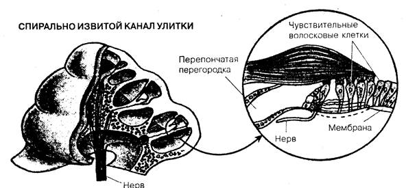 Наилучшее объяснение природы слуховых ощущений дает резонансная теория слуха Гельмгольца. Как известно, концевым аппаратом слухового нерва является орган Корти, покоящийся на основной перепонке, идущей вдоль всего спирального костного канала, называемого улиткой (рис. 7.7). Основная перепонка состоит из большого количества (около 24 000) поперечных волокон, длина которых постепенно уменьшается от вершины улитки к ее основанию. По резонансной теории Гельмгольца, каждое такое волокно настроено, подобно струне, на определенную частоту колебаний. Когда до улитки доходят звуковые колебания определенной частоты, то резонирует определенная группа волокон основной перепонки и возбуждаются только те клетки органа Корти, которые покоятся па этих волокнах. Более короткие волокна, лежащие у основания улитки, реагируют на более высокие звуки, более длинные волокна, лежащие у ее вершины, — на низкие.