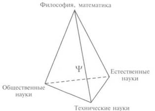 в различных отраслях1 психологии, каждая из которых занимается разрешением конкретных психологических задач. Данную схему также можно представить в виде треугольника, на одной из вершин которого находятся естественные науки, на другой — общественные науки, на третьей — технические науки. На наш взгляд, общественные и технические науки, вместе взятые, можно назвать гуманитарными науками, поскольку общество — это система объединенных определенными отношениями людей, а «техника» (от греч. techne — искусство, ремесло, мастерство) — совокупность средств и приемов человеческой деятельности, опосредствующих как отношения людей друг к другу, так и, собственно, отношения человека и природы. Однако наш треугольник — проекция на плоскость стереометрической фигуры, а именно треугольной пирамиды, на вершине которой находятся философские и математические науки (рис. 3). На наш взгляд, они, в отличие от