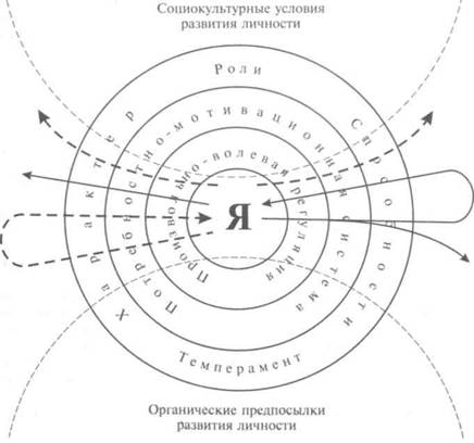 Для наглядности представим себе психологическую структуру личности (как мы говорили, в широком смысле слова) в виде шара, который имеет несколько внутренних «оболочек» (см. рис. 7). Прежде чем рассматривать их, укажем, что наш шар погружен своей нижней частью в сферу, которую мы, вслед за А. Г.Асмоловым, называем органическими предпосылками развития личности. Под этими последними подразумеваются, как правило, особенности телесной организации человека как индивида (т.е. особенности его конституции — телосложения, свойства нервной системы, задатки как органические предпосылки развития способностей, особенности его биохимических и других процессов и т.п.). Сами по себе эти особенности являются предметом других наук (физиологии ВНД, нейрофизиологии, антропологии и т.п.), и поэтому психология ими специально не занимается, но, поскольку они так или иначе обусловливают некоторые особенности ориентировочной деятельности субъекта в мире, также представляют определенный интерес и для изучающих психологию человека. В данном случае речь идет о психологическом изучении человека как продукта биологической эволюции, т.е. как индивида, поэтому, строго говоря, мы здесь изучаем «индивидные» свойства человека. К примеру, таким индивидным свойством является темперамент (под которым понимается совокупность формально-динамических особенностей человеческой деятельности и психики, таких, как темпо-ритмовые их характеристики, общий уровень активности субъекта и др.). В качестве органических предпосылок темперамента многие психологи называют свойства нервной системы,