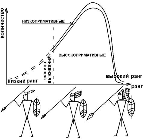 Таким образом, в условиях цивилизации методом целенаправленной селекции снижаются средние уровни примативности и рангового потенциала составляющих общество индивидов. Однако разница в способах селекции вела к различным результатам отбора. Попросту говоря, если тупо рубить головы всем, кто выпендривается, то снижается в среднем больше ранговый потенциал, чем примативность. А если издать разумную систему правил (законов) и рубить головы только тем, кто их не соблюдает, то снижаться в среднем будет больше примативность, чем ранговый потенциал.