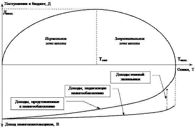Кривая Лаффера показывает также, куда перемещается предпринимательская деятельность при превышении определенного значения налоговых ставок, т.е. при нарушении принципа соразмерности налогообложения. При увеличении налоговых ставок в начале кривой побудительные мотивы хозяйствующих субъектов серьезно не затрагиваются и заинтересованность в легальных дохода, а также общий объем производства сокращаются медленнее, чем возрастает ставка, поскольку уменьшение налогооблагаемой базы происходит медленнее, чем увеличение ставки, доходы бюджета возрастают. Но как только ставка достигает некоторого уровня, дальнейшая уплата налога ведет к заметному сокращению чистого дохода налогоплательщика, начинается спад хозяйственной активности, уклонение от налогов приобретает массовый характер. Предпринимательская деятельность перемещается из легальной сферы в тень. Вследствие этого, несмотря на рост налоговых ставок, бюджетные доходы сокращаются.