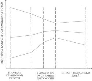 Кривые, изображенные на нем, показывают, что первоначально различные мнения испытуемых в ходе и в результате дискуссии становились более единообразными. Это свидетельствует об их взаимном влиянии друг на друга, о становлении групповой нормы суждений и о ее воздействии на индивидуальные мнения членов группы. Оказалось, что влияние групповой нормы не исчезает и после завершения эксперимента, хотя при этом и обнаруживается тенденция частичного возврата к первоначальному мнению.