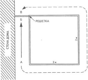 Опыт 3. Неподалеку от стены дома образуется квадратное, 2x2 м, пространство, обнесенное невысоким забором (рис. 32). Одна его сторона, отдаленная от стены на 1 м, расположена параллельно стене, образуя проход длиной в 2 м. Один конец прохода закрывают решеткой и в направлении от А к Б вводят в этот проход собаку (направление указано на рисунке стрелкой). Там она некоторое время ест корм. Когда он съеден и