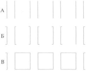 Принципы перцептивной организации зрительного восприятия иллюстрируются рис. 36. Ближе друг к другу расположенные линии в ряду А скорее объединяются друг с другом в нашем восприятии, чем далеко расставленные. Добавление горизонтальных, разнонаправленных отрезков к отдельным, стоящим далеко друг от друга вертикальным линиям в ряду Б побуждает нас, напротив, видеть целостные фигуры в них, а не в близко расположенных линиях. В данном случае это квадраты. Соответствующее впечатление усиливается еще больше (ряд В), становится необратимым, если контуры оказываются замкнутыми.