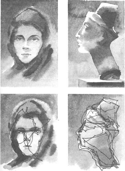 Выяснилось, что восприятие человеком более сложных, осмысленных изображений происходит по-иному. Здесь в первую очередь срабатывает механизм влияния прошлого опыта и мышления, выделяющий в воспринимаемом изображении наиболее информативные места, на основе которых, соотнеся полученную информацию с памятью, можно о нем составить целостное представление. Анализ записей движений глаз, проведенный АЛ.Ярбусом1, показал, что элементы плоскостных изображе-