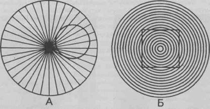 Нередко при восприятии контурных и штрихованных изображений, а также соответствующих элементов реальных предметов у человека могут возникать зрительные иллюзии. Таких иллюзий известно множество. Две из них для примера показаны на рис. 39. Это — иллюзии, связанные с искажением контура окружности, представленной на фоне веерообразно расходящихся линий (А), и искажение изображения квадрата на фоне концентрических окружностей (Б).