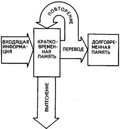 Переход информации из кратковременной в долговременную память связан с рядом особенностей. В кратковременную память попадают последние 5 или 6 единиц информации, поступившие через органы чувств, они-то и проникают в первую очередь в долговременную память. Сделав сознательное усилие, повторяя материал, можно удерживать его в кратковременной памяти и на более длительный срок, чем несколько десятков секунд. Тем самым можно обеспечить перевод из кратковременной в долговременную память такого количества информации, которое превышает индивидуальный объем кратковременной памяти. Этот механизм лежит в основе запоминания путем повторения.