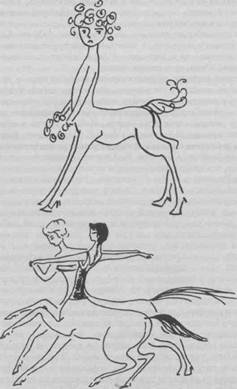 Таким образом, с продуктивным воображением в искусстве мы встречаемся и в тех случаях, когда воссоздание действительности реалистическим методом художника не устраивает. Его мир — фантасмагория, иррациональная образность, за которой — вполне очевидные реалии. Плодом такого воображения является роман М.Булгакова «Мастер и Маргарита», фантастика братьев Стругацких, антиутопии в русской и зарубежной литературе (Е.Замятин, О.Хаксли, Дж.Оруэлл), фантастические кентав-рицы и кентаврята четырнадцатилетней московской школьницы Нади Рушевой (рис. 49). Обращение к столь необычным, причудливым образам позволяет усилить интеллектуальное и эмоционально-нравственное воздействие искусства на человека.