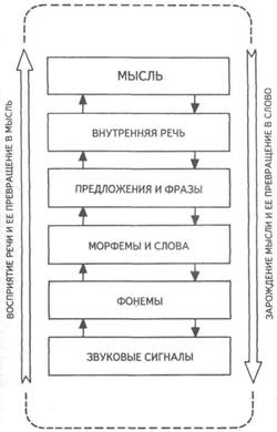 Усвоение речи ребенком начинается с выделения речевых сигналов из всей совокупности звуковых раздражителей. Затем в его восприятии эти сигналы объединяются в морфемы, слова, предложения, фразы. На базе их формируется связная, осмысленная внешняя речь, обслуживающая общение и мышление. Процесс перевода мысли в слово идет в обратном направлении.