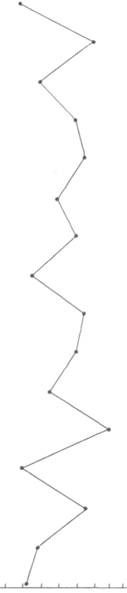 В опроснике Кеттела более 100 вопросов, которые задаются испытуемым; на них они отвечают утвердительно или отрицательно. Затем ответы группируются в соответствии с «ключом» (способом обработки результатов) и определяется выраженность того или иного фактора, свидетельствующего о развитии соответствующей черты личности. Затем вычерчивается так называемый «личностный профиль» испытуемого, включающий его оценки по каждому фактору. Пример такого профиля приведен на рис. 58.