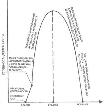 Представленная на этом рисунке кривая показывает, что между эмоциональным возбуждением и эффективностью деятельности человека существует криволинейная, «колоколообразная» зависимость. Для достижения наивысшего результата в деятельности нежелательны как слишком слабые, так и очень сильные эмоциональные возбуждения. Для каждого человека (а в целом и для всех людей) имеется оптимум эмоциональной возбудимости, обеспечивающий максимум эффективности в работе. Оптимальный уровень эмоционального возбуждения, в свою очередь, зависит от многих факторов: от особенностей выполняемой деятельности, от условий, в которых она протекает, от индивидуальности включенного в нее человека и от многого другого. Слишком слабая эмоциональная возбужденность не обес-