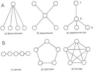На рис. 71, А показаны три варианта централизованной структуры: фронтальная, радиальная и иерархическая. Фронтальная структура каналов коммуникаций (а) характеризуется тем, что ее участники непосредственно находятся рядом и, не вступая в прямые контакты, могут все же видеть друг друга. Это позволяет им в какой-то степени учитывать поведение и реакции друг друга в совместной деятельности. Наиболее знакомым для учителя примером фронтальной структуры является та, которая образуется в классе на уроке, при фронтальной работе.