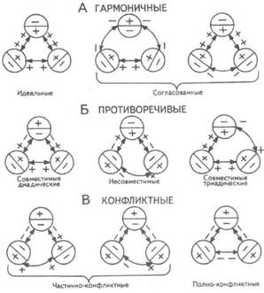 Межличностные отношения членов группы-триады, как и взаимоотношения участников группы-диады, могут быть трех типов: положительные, отрицательные и неодинаковые (когда один относится к другому положительно, а тот к нему, напротив, отрицательно). Различные сочетания этих типов отношений порождают разные варианты взаимоотношений в группе-триаде. Первый вариант — гармонические взаимоотношения (А). Они характеризуются тем, что между тремя различными парами, на которые может быть разделена группа-триада, складываются или только положительные, или только отрицательные вза-