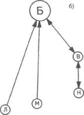 Рис. 75. Масштабная социограмма, наглядно представляющая взаимоотношения в группе, включающей 11 человек. На рисунке видно четкое разделение данной группы на две подгруппы а) и б) со своими лидерами А и Б