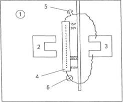 Рис. 81. Схема обстановки в лаборатории во время проведения эксперимента С.Милгрэма: 1 — место экспериментатора, 2 — место «учителя», 3 — место «ученика», 4 — пульт с кнопками, включающими нужное напряжение в сети, 5 — электрический звонок, 6 — электрическая лампочка