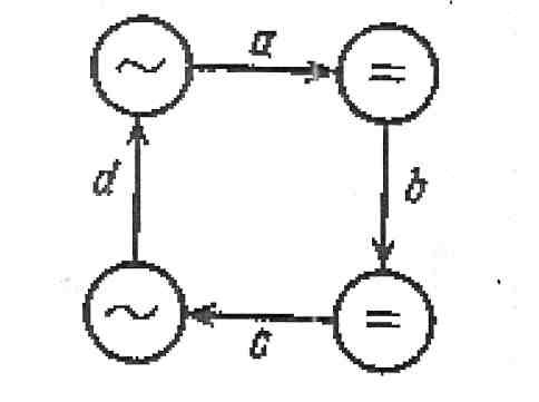 Систематизация преобразователей в соответствии с принципиальными особенностями схемы связана с их функциональным назначением, как это схематически показано на рис. 1. Стрелка а показывает преобразование переменного тока (или напряжения) в постоянный (выпрямители), стрелка b соответствует преобразованию постоянного тока в постоянный ток с другими параметрами, чаще всего регулируемыми (импульсные преобразователи постоянного тока), стрелка с означает преобразование постоянного тока в переменный (инверторы), а стрелка d— преобразование переменного тока в