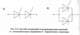 Для уменьшения вероятности электрического и теплового пробоя в ПП применяют последовательное или параллельное соединение полупроводниковых вентилей (рис. 9.4)