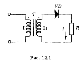 Схема однополупериодного выпрямителя изображена на рис. 12.1, где Т - трансформатор, VD - полупроводниковый диод, а R - нагрузка.
