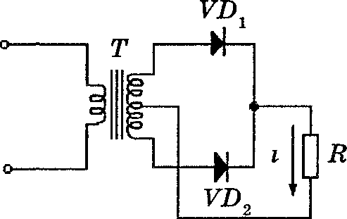 На рис. 12.3 изображена двухполупериодная схема, где Т -трансформатор с отводом от середины вторичной обмотки, VD1 и VD2 - полупроводниковые диоды, а R - нагрузка.34эм.14.11.14г.