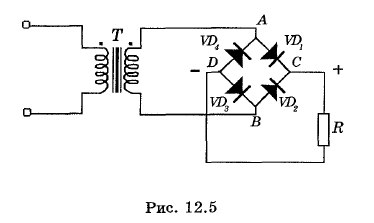 Мостовая схема выпрямления изображена на рис. 12.5 и состоит из трансформатора Т и четырех диодов: VD1 - VD4.