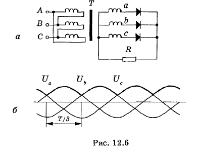 Рассмотрим теперь трехфазные схемы выпрямления. Простейшая трехфазная схема выпрямления тока с нейтральной точкой изображена на рис. 12.6, а.