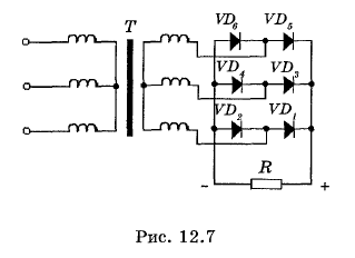 Мостовая трехфазная схема выпрямления переменного тока изображена на рис. 12.7. В ней сочетаются принципы мостовой схемы и схемы многофазного выпрямления. В этой схеме нулевая точка трансформатора для выпрямления не нужна и поэтому первичные и вторичные обмотки могут быть соединены как звездой, так и треугольником.