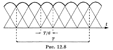 Шесть диодов образуют две группы - нечетную VD1, VD3 и VD5 и четную VD2, VD4 и VD6. У нечетной группы катоды соединены вместе и служат точкой вывода выпрямителя с положительным потенциалом, а у четной группы - аноды соединены вместе и служат точкой вывода с отрицательным потенциалом. При работе этой схемы выпрямляются обе полуволны переменных напряжений всех вторичных обмоток трансформатора, благодаря чему пульсации выпрямленного напряжения значительно уменьшаются. В схеме на рис. 12.7 в каждый момент работает тот диод нечетной группы, у которого анод в этот момент имеет наибольший положительный потенциал, а вместе с ним тот диод четной группы, у которого катод имеет наибольший по абсолютной величине отрицательный потенциал. Выпрямленное напряжение будет изменяться по огибающей с двойной частотой пульсаций (рис. 12.8).