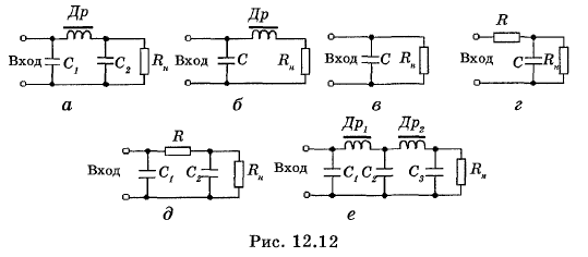 При небольших токах нагрузки успешно работает Г-образный фильтр (рис. 12.12, б), а при малых токах нагрузки в качестве сглаживающего фильтра достаточно включить конденсатор (рис. 12.12, в), что и делается в переносных радиоприемниках и магнитолах. Во многих случаях дроссель заменяют резистором, что несколько снижает качество фильтрации, но зато значительно удешевляет фильтр (рис. 12.12, г, д). В наиболее ответственных случаях сглаживающий фильтр делают многозвенным, состоящим из нескольких П-образных или Г-образных LС или RС фильтров (рис. 12.12, е).