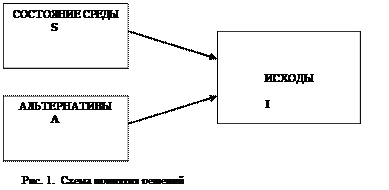 Здесь S – множество состояний среды, A- множество альтернатив, I - множество всевозможных исходов. На исход оказывает влияние как решение, принимаемое ЛПР, так и состояние среды.