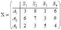 Таблицу можно свернуть в матрицу выплат (матрицу эффективности, платежную матрицу) Х = ||xij||, где i – номер строки матрицы выплат, т. е. варианта решений (альтернативы), j – номер столбца матрицы, т. е. состояние природы.