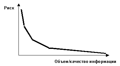 На рис. 5.1 показана предполагаемая зависимость вероятности риска принятия некачественного (убыточного) решения и объема/качества информации. Большая вероятность возникновения риска соответствует минимуму качественной информации.