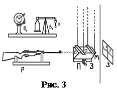 ЭКСПЕРИМЕНТАЛЬНАЯ УСТАНОВКА. Баллистический маятник М (рис.3) подвешен на четырех длинных нитях к кронштейну. Выстрел производится из пневматического ружья Р, установленного неподвижно в зажиме и нацеленного в отверстие маятника. Для определения горизонтального смещения маятника служит линейка с миллиметровыми делениями.