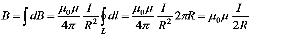 Следовательно, индукция магнитного поля B в центре кругового проводника радиусом R с током I: