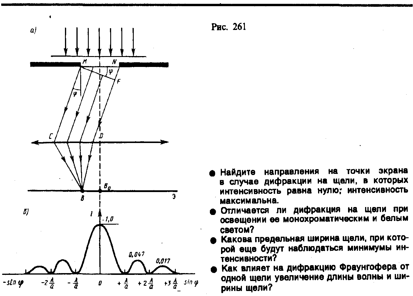 Фраунгофер рассмотрел дифракцию плоских световых волн, или дифракцию в параллельных лучах, которую можнонаблюдать в том случае, если источник света и точка наблюдения бесконечно удалены от препятствия, вызвавшего дифракцию. Чтобы этот тип дифракции осуществить, достаточно точечный источник света поместить в фокусе собирающей линзы, а дифракционную картину исследовать в фокальной плоскости второй собирающей линзы, установленной за препятствием. Если плоская монохроматическая световая волна падает нормально плоскости узкой щели шириной а (рис. 5), то оптическая разность хода D между крайними лучами МС и ND, идущими от щели в произвольном направлении j (j – угол дифракции):
