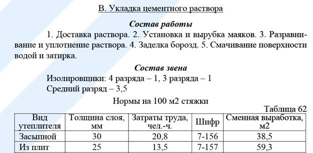 Определите трудоемкость работ по устройству цементно-песчаной стяжки по засыпному утеплителю при площади кровли 360 м2. Укажите состав звена при выполнении данной работы.
