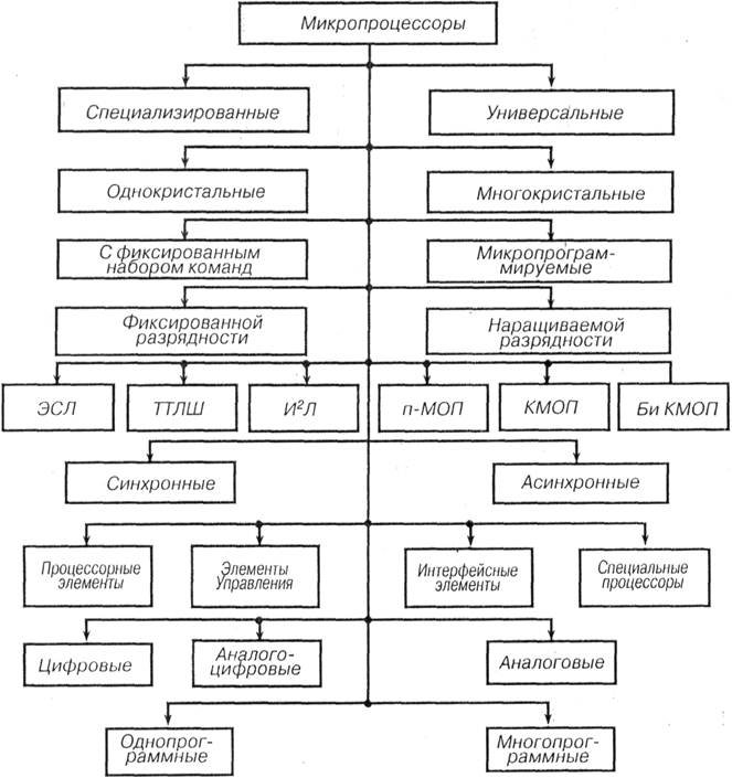 По технологии изготовления и связанной с ней схемотехнической элементной базе различают МП БИС на основе схемотехники типа МОП, биполярной и комбинированной биполярно-полевой (Би-КМОП). Первые поколения МП БИС были реализованы на основе p - (p -МОП) и n -канальных (n -МОП) транзисторов, современные поколения проектируются на основе усовершенствованной КМОП-схемотехники и технологии. Микропроцессорные БИС на основе комбинированной биполярно-полевой (Би-КМОП) технологии обладают наилучшим сочетанием характеристик, обеспечивая высокие быстродействие и нагрузочную способность при сравнительно небольшой, присущей КМОП БИС, мощности потребления. Наибольшее распространение получили МП БИС типа КМОП и Би-КМОП.