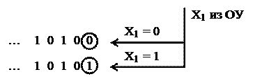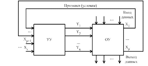 Иногда последовательность действий при выполнении операций зависит от состояния узлов ОУ или, иначе, от некоторых признаков, связанных с результатами микроопераций. Такие признаки X1, X2, …, Xp выдаются из ОУ и поступают в УУ. Некоторые признаки Xp + 1, …, Xs могут поступать извне, определяя порядок работы МП. Формируя управляющие сигналы УУ обязано в соответствующие тактовые периоды ориентироваться на признаки. В ОУ поступают данные и выдаются данные.