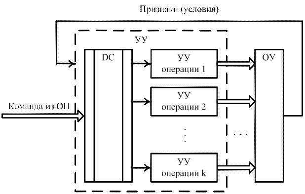 УУ содержит k устройств управления операциями (логических схем). Для выбора одной из них дешифратор декодирует операционное поле команды, поступающей из основной памяти (ОП). В зависимости от кода операции, указанного в команде, выбирается УУ операцией, которое выдает на входы ОУ нужную последовательность управляющих сигналов.