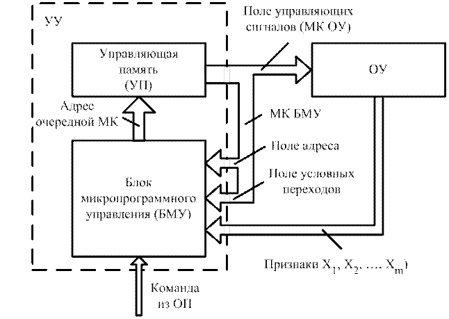 Микропрограммы различных операций хранятся в УП. Для выполнения каждой МК необходимо задать ее адрес и прочитать из УП.