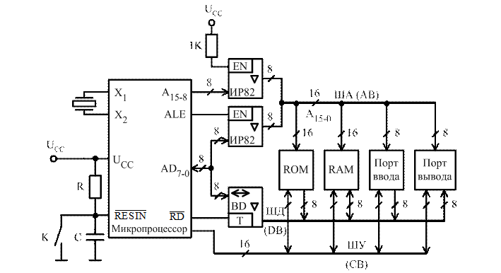 Внутренняя восьмиразрядная шина данных передает байты между различными внутренними регистрами или обменивается с другими модулями МПС через мультиплексируемую шину адресов/данных.